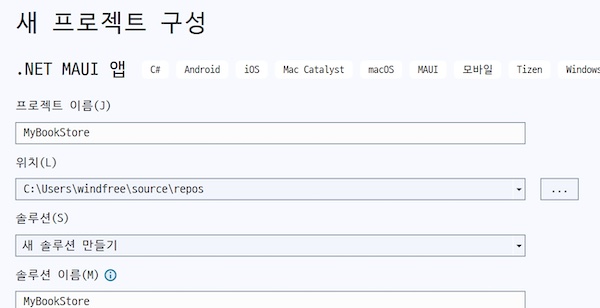 프로젝트명을 적절하게 설정합니다. 여기서는 "MyBookStore" 라고 하였습니다.